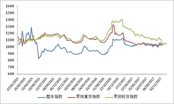 各車型指數(shù)漲跌不一,其中整車指數(shù)、零擔(dān)重貨指數(shù)環(huán)比回升,零擔(dān)輕貨指數(shù)環(huán)比回落。其中,整車指數(shù)為1020.3點(diǎn),比上周回升0.16%;零擔(dān)輕貨指數(shù)為1021.3點(diǎn),環(huán)比回落1.75%;零擔(dān)重貨指數(shù)為1018.8點(diǎn),環(huán)比回升0.19%。