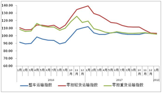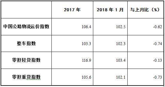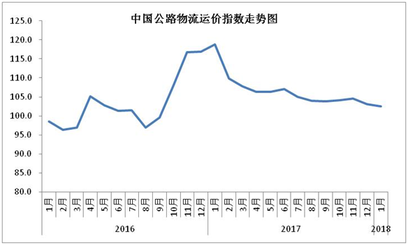 由中國物流與采購聯(lián)合會和林安物流集團(tuán)聯(lián)合調(diào)查的中國公路物流運價指數(shù)2018年1月為102.5點,比上月回落0.62%,連續(xù)兩個月小幅回落。