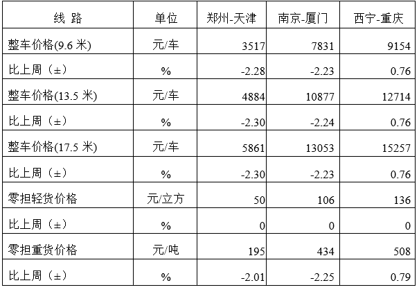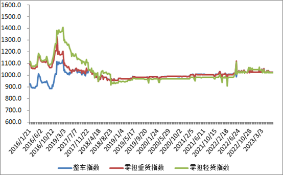 分車型看,各車型指數(shù)環(huán)比漲跌互現(xiàn)。其中,整車指數(shù)為1024.59點(diǎn),比上周回升0.04%;零擔(dān)輕貨指數(shù)為1020.17點(diǎn),比上周回落0.02%;零擔(dān)重貨指數(shù)為1023.64點(diǎn),比上周回落0.11%。