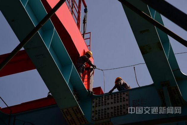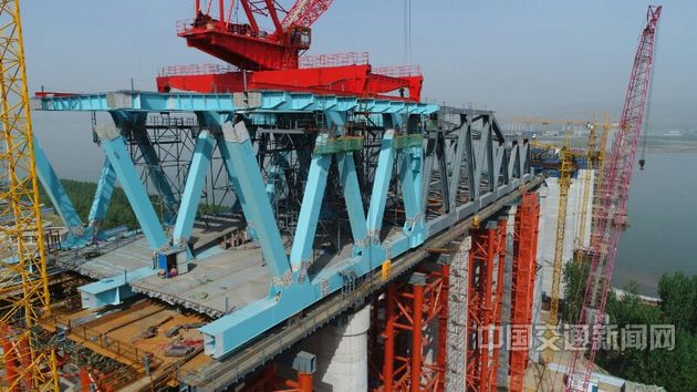 蒙華鐵路三門峽黃河公鐵兩用大橋全長5663.75米,由中國鐵建大橋局承建,北起山西省運城市,南至河南省三門峽市,橫跨黃河,連接山西、河南兩個省區(qū),是蒙華鐵路全線控制性工程。主橋承載著四線鐵路和六車道高速公路,梁部為連續(xù)鋼桁梁,采用頂推法施工。頂推總長度1142.5米,頂推總重量近4.3萬噸,相當(dāng)于2萬臺普通轎車同時行駛在大橋上,設(shè)計活載473米/千牛,其頂推長度、重量均居世界首位。