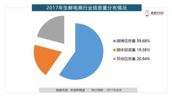 據(jù)新浪輿情通大數(shù)據(jù)分析顯示,2017年,生鮮電商整體網(wǎng)絡(luò)輿情傳播熱度指數(shù)5.42,全年相關(guān)輿情信息量197.14萬條,微博信息量和媒體報道量為主要信息來源,分別占比59.68%和19.38%。