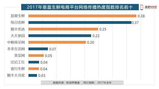 與綜合性生鮮電商不同,垂直生鮮電商一般會從生鮮產(chǎn)品源頭開始介入產(chǎn)業(yè)鏈的各個環(huán)節(jié),全程把控供應鏈,保證商品品質(zhì)和用戶體驗。在主要垂直生鮮電商平臺中,據(jù)新浪輿情通大數(shù)據(jù)分析顯示,2017年,易果生鮮、每日優(yōu)鮮、順豐優(yōu)選網(wǎng)絡(luò)傳播熱度指數(shù)排名前三位,天天果園、中糧我買網(wǎng)、本來生活網(wǎng)、美菜網(wǎng)、沱沱工社、食行生鮮、順豐大當家熱度排名四到十位。