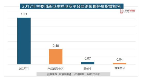 據(jù)新浪輿情通大數(shù)據(jù)分析顯示,在主要創(chuàng)新型生鮮電商平臺中,2017年盒馬鮮生所受輿論關(guān)注明顯高于其他平臺,全年網(wǎng)絡(luò)傳播熱度指數(shù)1.23,媒體報道量7.59萬條,永輝超級物種、蘇鮮生、7FRESH所受輿論關(guān)注緊隨其后。