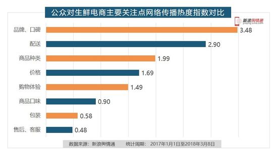 在輿論對生鮮電商主要關(guān)注點方面,據(jù)新浪輿情通大數(shù)據(jù)分析顯示,2017年至今,品牌、口碑成為公眾通過電商平臺進行生鮮商品購物時最為關(guān)注的內(nèi)容,此外,生鮮電商的商品配送、種類、價格、購物體驗、商品口味、商品包裝以及售后也較受輿論關(guān)注。