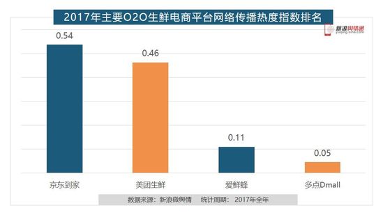 O2O生鮮電商則通過與便利店或超市的合作,進行生鮮產(chǎn)品的銷售,配送范圍一般不超過5公里,可在2小時內(nèi)送達,能夠滿足用戶的及時性需求。在主要O2O生鮮電商平臺中,據(jù)新浪輿情通大數(shù)據(jù)分析顯示,2017年,京東到家、美團生鮮所受輿論關(guān)注較高,愛鮮蜂、多點Dmall熱度排名位列其后。