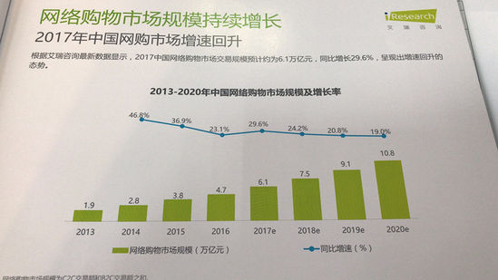數(shù)據顯示,2017年中國網絡購物市場交易規(guī)模預計約為6.1億元,同比增長29.6%,較前幾年有小幅度的回升。