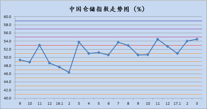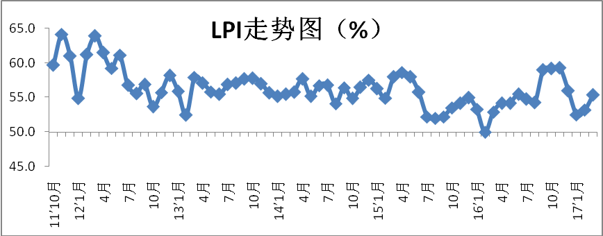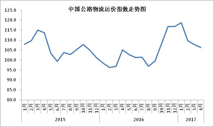 中國物流與采購聯(lián)合會發(fā)布的2017年4月份中國物流業(yè)景氣指數(shù)為58.2%較上月回升2.8個百分點(diǎn);中國倉儲指數(shù)為55.1%,較上月回升0.6個百分點(diǎn);中國公路物流運(yùn)價指數(shù)為106.3點(diǎn),比上月回落1.5%。
