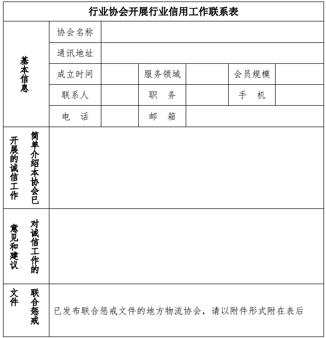 請有意加入行業(yè)信用工作的地方物流協(xié)會請?zhí)顚懜郊缎袠I(yè)協(xié)會開展行業(yè)信用工作聯(lián)系表》并提交至中物聯(lián)(網(wǎng)絡(luò)事業(yè)部)。已提交《物流行業(yè)誠信廣州倡議書簽署備案表》的地方物流協(xié)會,直接提交聯(lián)合懲戒文件即可。